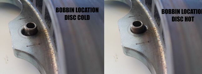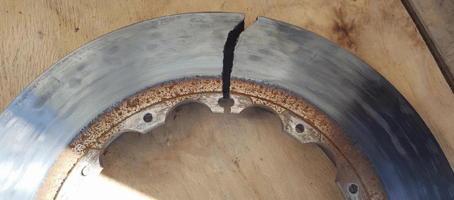 To give you an indication of the extreme forces at play here, imagine trying to bend a 32mm-thick chunk of steel 1mm — this is what is happening when your non floating disc is "coning" during hot racing conditions. These forces are enough to crack discs and we've even seen some split entirely in two. A Steel/iron disc can expand up to around 2mm in total diameter at maximum temperatures — crazy right? The ultimate solution is a two-piece rotor if you're serious about your braking performance.